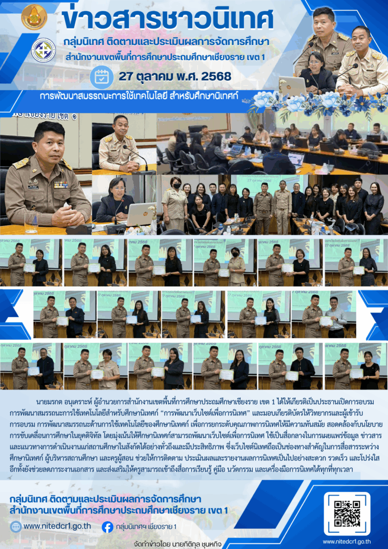 @aumrussada การพัฒนาสมรรถนะการใช้เทคโนโลยีสำหรับศึกษานิเทศก์ เพื่อสร้างเว็บไซต์ในการนิเทศการศึกษา ในวันที่ 27 ตุลาคม 2568 ณ ห้องประชุมพวงชมพู สพป เชียงราย เขต 1 ผู้เข้ารับการอบรมประกอบด้วยคณะศึกษานิเทศก์ บุคลากรกลุ่มนิเทศ โดยมี นายมรกต อนุเคราะห์ ผอ.สพป.เชียงราย เขต 1 ประธานเปิดการอบรมพัฒนา พร้อมด้วย นายอภิปราย โสภายิ่ง รอง ผอ.สพป.เชียงราย เขต 1 ร่วมกิจกรรมการพัฒนาในครั้งนี้